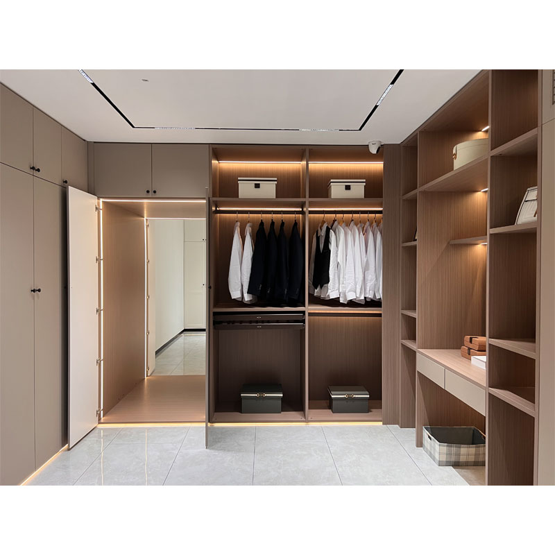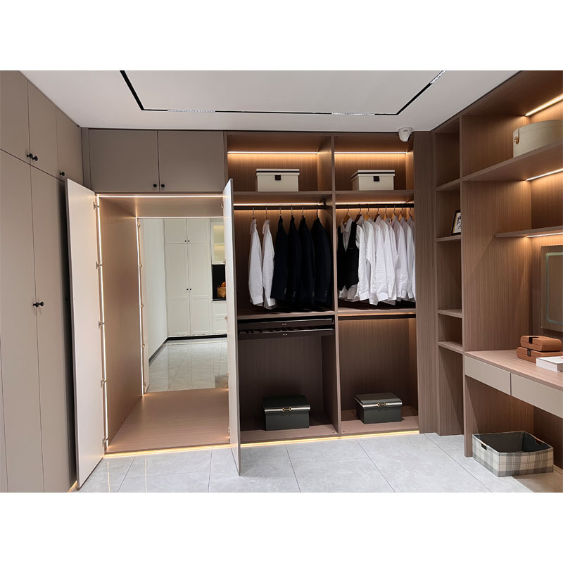 Bu, yeni tasarlanmış lüks DIY gömme dolaplarımızdan biridir. U şeklindeki dolaplar, tüm giysilerinizi ve nevresimlerinizi saklamak için tüm duvar alanını tamamen kullanır. Günlük cilt bakımı ve makyaj ihtiyacını karşılamak için makyaj masası da bulunmaktadır.