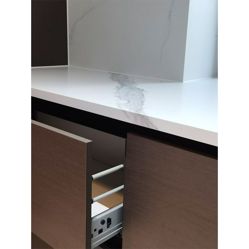 Akıllı mutfak üst düzey Laminat mutfak dolaplarının tezgah üstü, dokunuşu pürüzsüz, bakması güzel, temizlemesi kolay, güçlü ve dayanıklı kuvars taşından yapılmıştır.
